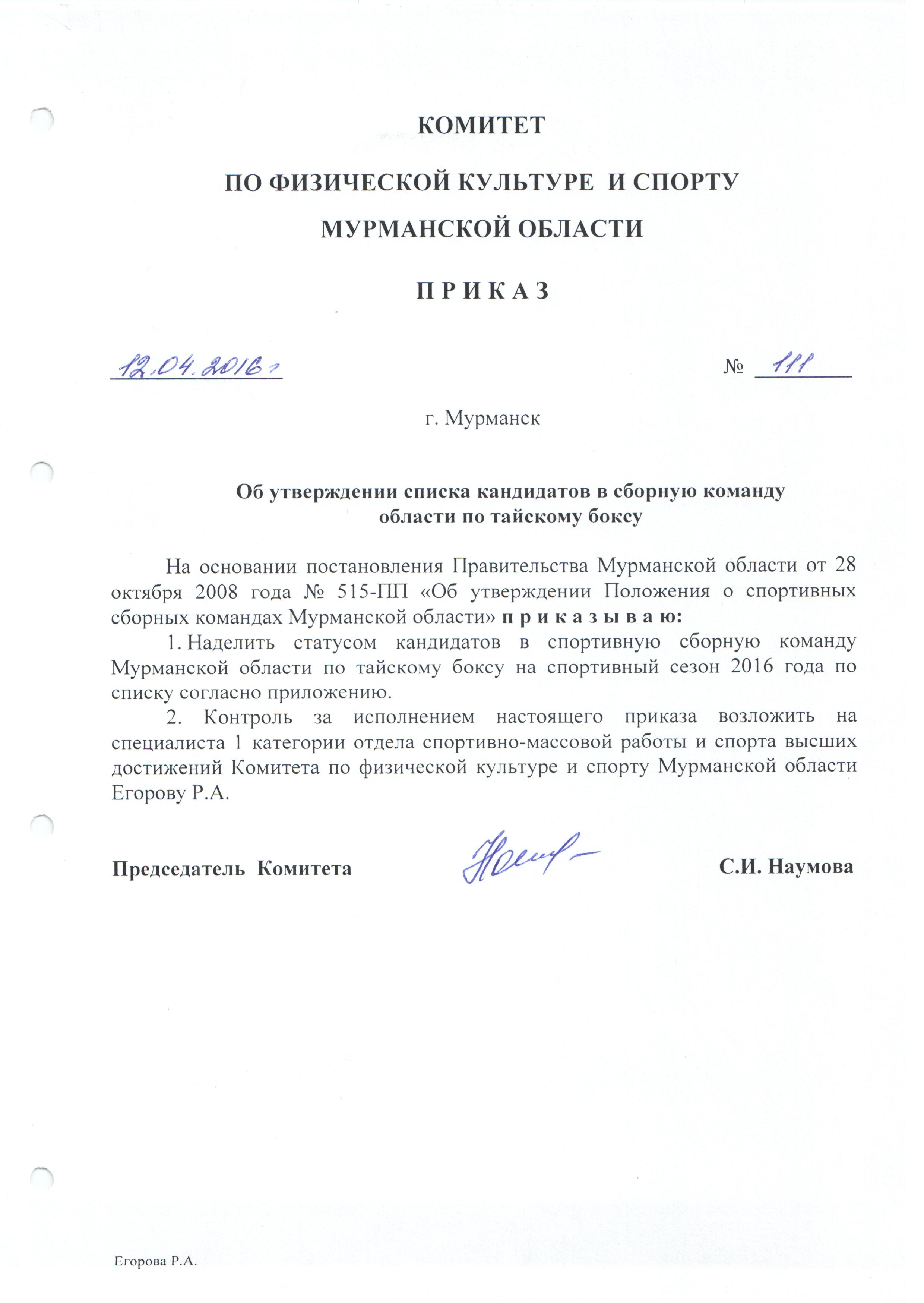 Приказ от 22.01.2014 № 34 "О наделении статусом "Спортивная сборная команда Мурманской области по тайскому боксу"